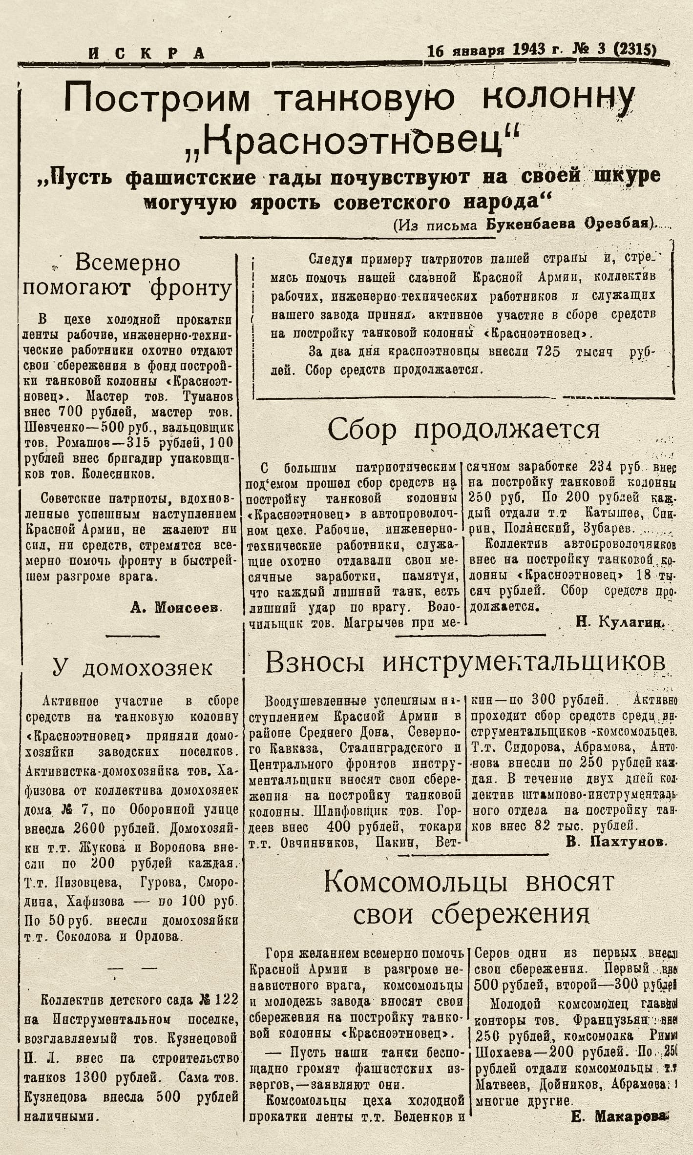 На постройку собственной танковой колонны «Красноэтновец» заводчане собрали 2,5 млн руб. и получили в телеграмме личную благодарность И. Сталина