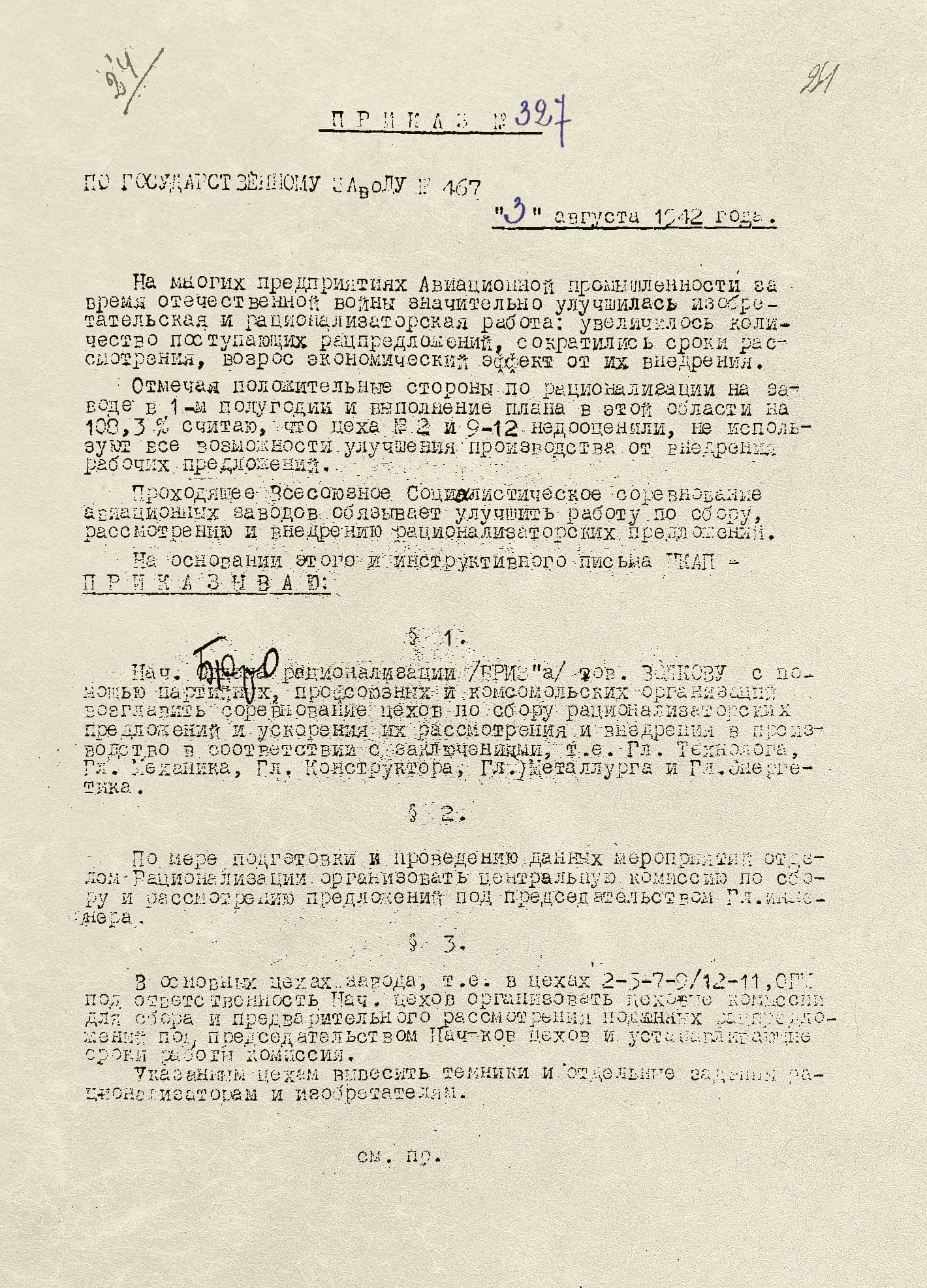 «Я окончил ремесленное училище при заводе автотракторного инструмента, но на работу был направлен слесарем-инструментальщиком на завод № 467 14 декабря 1943 года. А мне тогда очень хотелось стать токарем. На заводе в инструментальном цехе № 2 меня быстро научили токарному делу и перевели в цех № 5 в группу механика, а потом я попросился на обточку комля лопасти для винта ВИШ-105. Вот эта работа пришлась мне по душе! Хотя и очень тяжелыми были заготовки, трудно перевыполнить норму выработки, меня радовало то, что я сам, своими руками делаю продукцию для настоящих боевых самолетов. И таких мальчишек, как я, в цехе было много. Мы на обработке комля лопасти — обточке нескольких диаметров и нарезке резьбы — сами организовали молодежную бригаду, в которую кроме меня вошли Ю. В. Боков и А. Ф. Усанин. Мы втроем за 12 часов успевали обрабатывать 90 лопастей— а это значит, что еще 30 (на винт шло три лопасти) самолетов скоро взлетят в воздух.