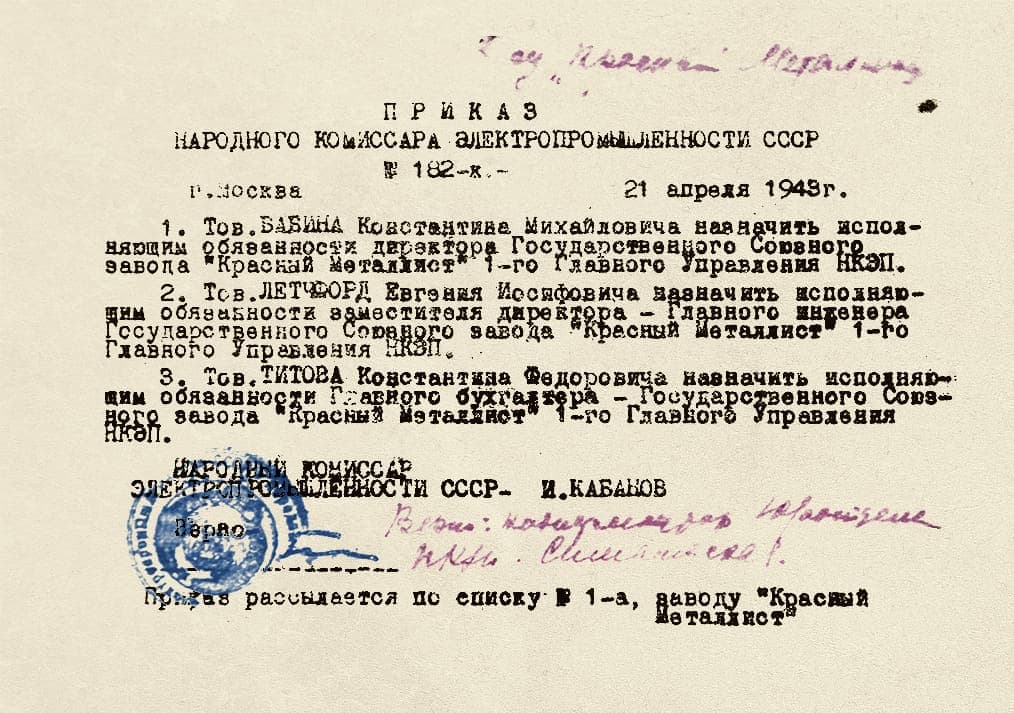 На территории «Красного металлиста» было организовано семь новых цехов, освоены производства электроузлов, резиновых деталей, тонкостенных фасонных труб, пластмассы и прочих компонентов. Завод сразу приступил к изготовлению целого ряда новых изделий, в том числе прибора для беспузырной торпедной стрельбы с подводных лодок. За 10 месяцев 1943 года выпустили 192 таких прибора.