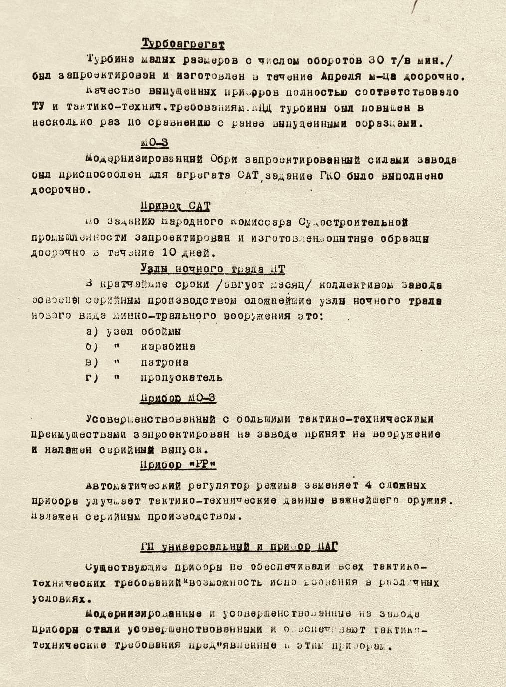 Наряду с плановыми работами выполнялось специальное задание по изготовлению таких приборов, как спидограф, гидрофон и стабилизатор глубины для торпед.