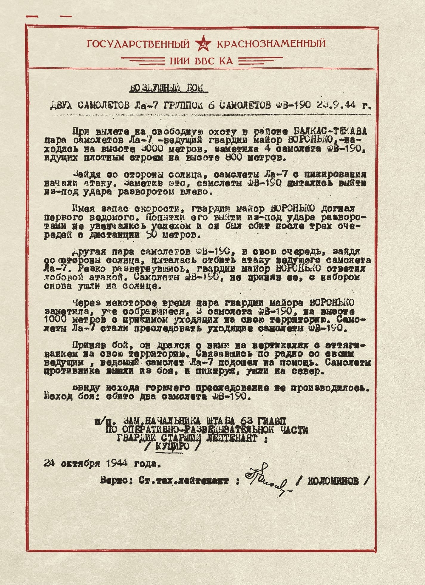 Но в большинстве случаев Ла-7 имел значительные преимущества по скорости полета, скороподъемности и маневренности перед своим ближайшим противником — Focke-Wulf 190D. Историки отмечают, что улучшение летно-технических данных Ла-7 по сравнению с Ла-5 изменило тактику наших истребителей над полем боя: у сковывающей группы отпала необходимость находиться с большим превышением над ударной, так как Ла-7 в случае необходимости быстро успевал набрать высоту и занять выгодную позицию. Поэтому во время патрулирования при обнаружении самолетов противника независимо от их числа Ла-7 немедленно принимали бой.