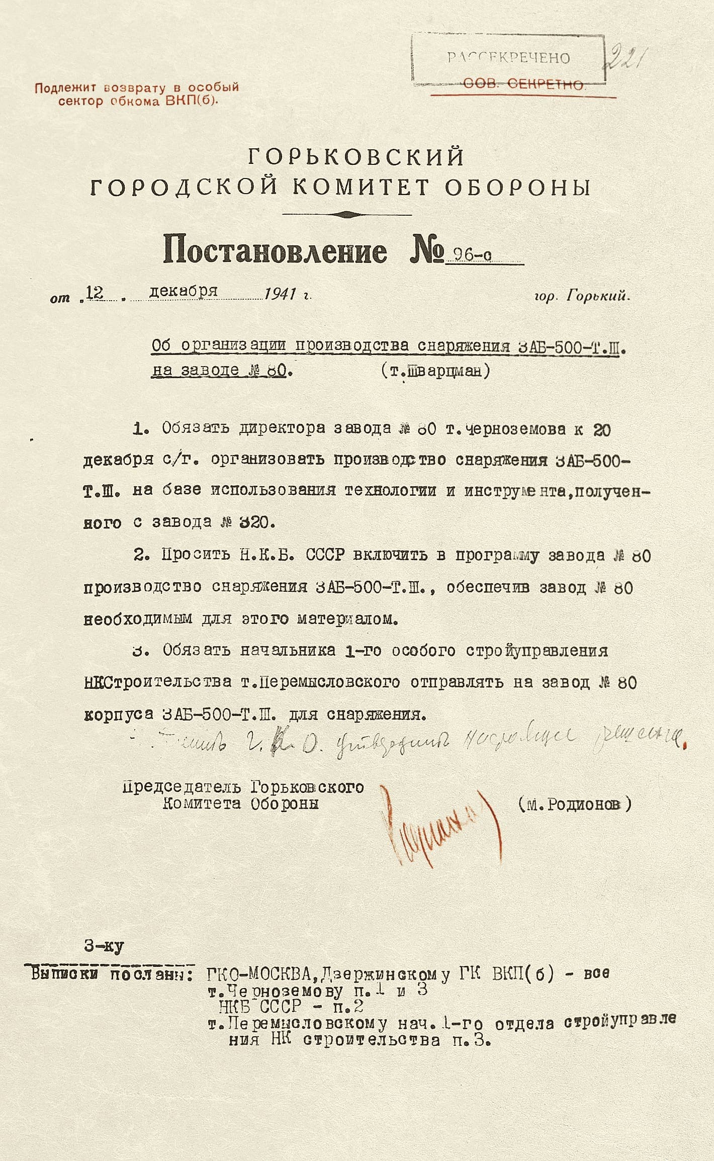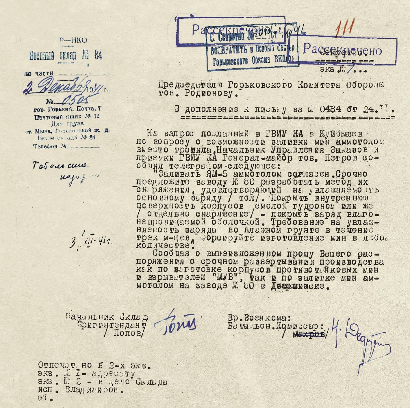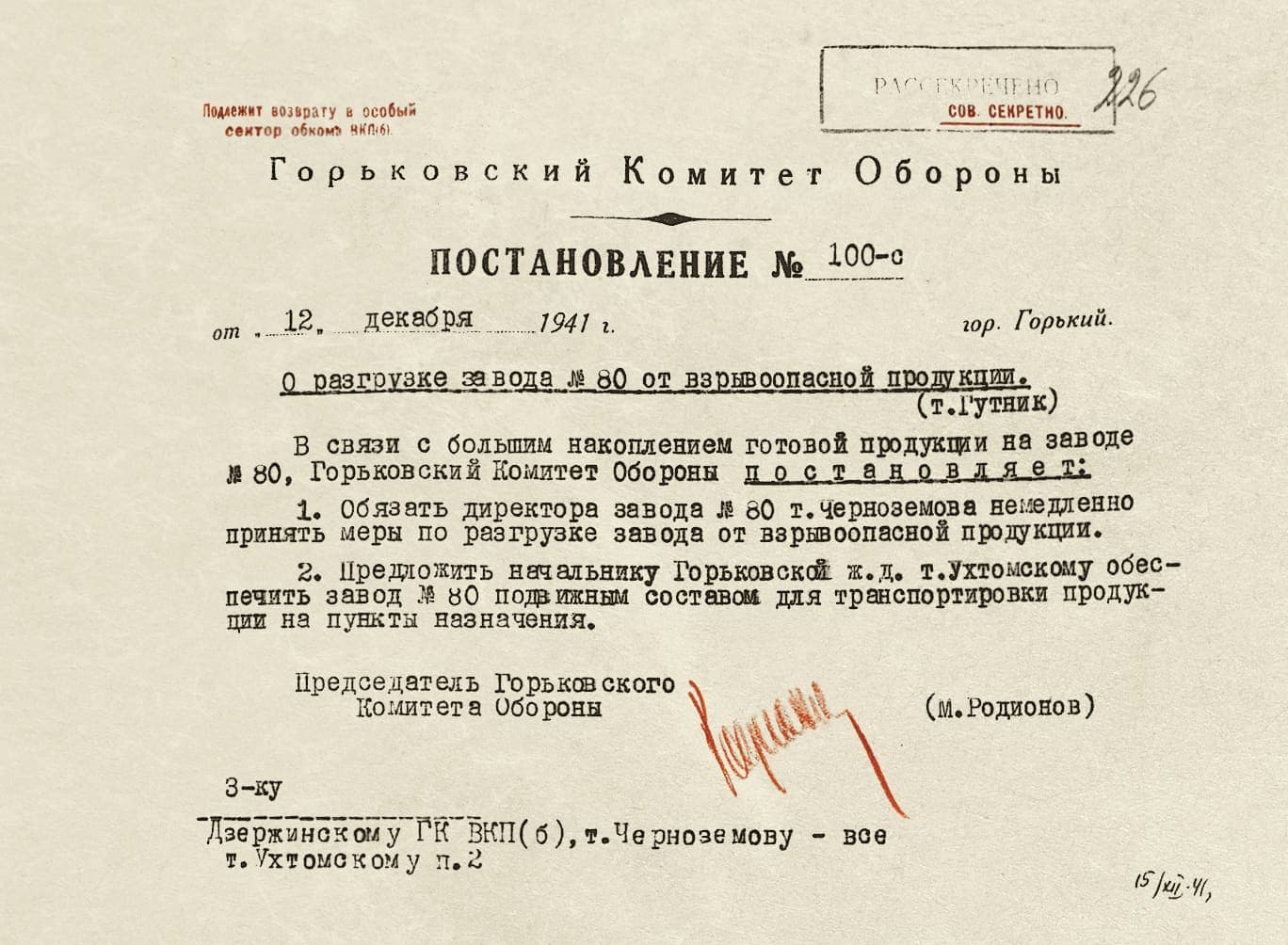 Мобилизационный план на второе полугодие 1941 года предполагал рост выпуска боеприпасов по сравнению с первым полугодием в три раза, взрывчатых веществ — вдвое. Из-за эвакуации большего количества других боеприпасных заводов страны горьковскому предприятию предстояло освоить производство 33 новых номенклатур боеприпасов и технологию снаряжения суррогатными веществами (взрывчатые вещества на основе аммонийной селитры) 23-х видов продукции (что в перспективе обеспечивало 70-процентную экономию тротила).