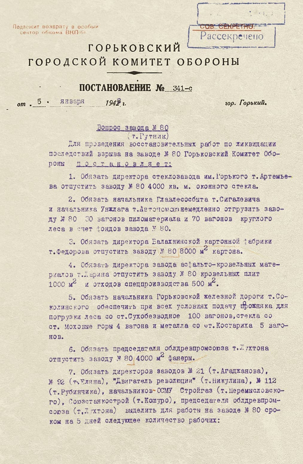Партком предложил директору Горину в однодневный срок лично решить все вопросы, связанные с переходом на мобилизационный график, в том числе по номенклатурам, переходящим на рецептуру военного времени. В августе того же года на заседание парткома пригласили уже другого директора, К. И. Черноземова. По результатам собрания была принята резолюция «О недостатках начала работы в войну», и партком решил поставить под свой жесткий контроль «выполнение производственной программы» и «немедленное введение освоенных мощностей в цехах 1, 2, 5, 5а, 6, 7, 18». Директора завода обязали обеспечить цехи лучшими высококвалифицированными работниками, обеспечить четкое снабжение производства и перестроить работу железнодорожного транспорта.